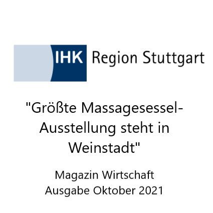 Deschiderea expoziției noastre mari de scaune de masaj pentru uz comercial și privat a fost inclusă în revista Wirtschaft 10.2021 a Camerei de Comerț și Industrie din regiunea Stuttgart. https://www.stuttgart.ihk24.de/presse/magazin-wirtschaft/firmenreport-4785728