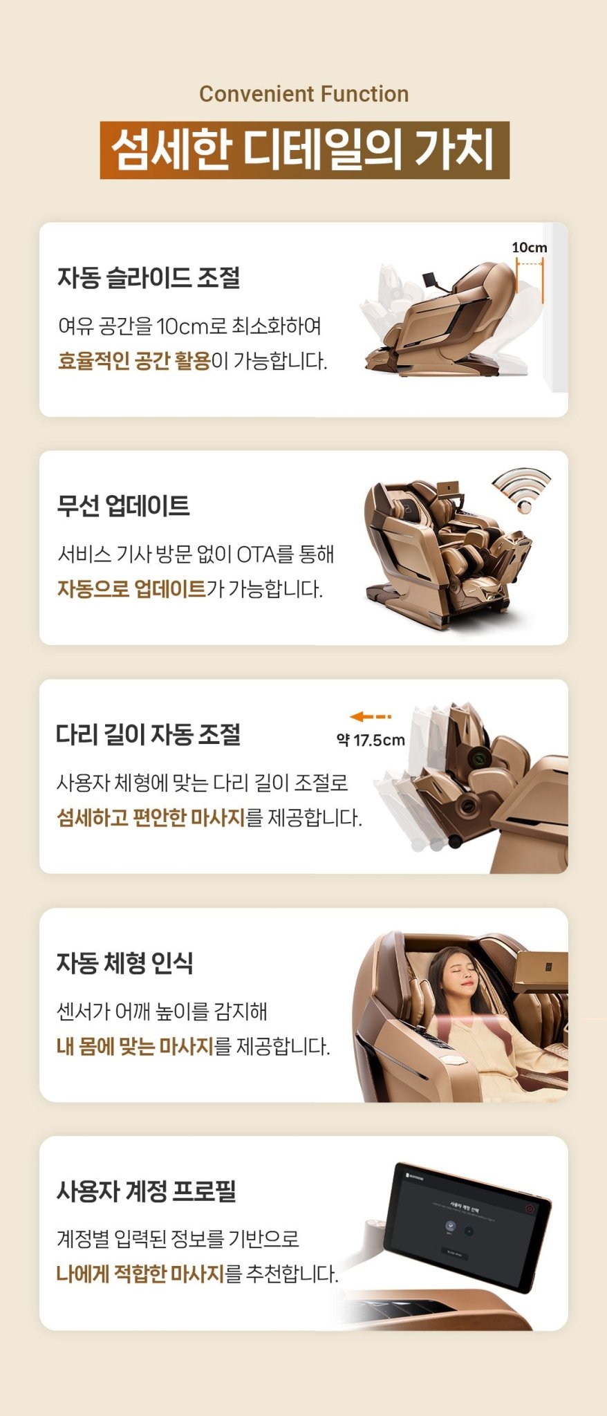 Fotoliul de masaj Bodyfriend Quantum a fost dezvoltat pentru cei care doresc cea mai bună relaxare și bunăstare. Cu sistemul audio integrat de la Bang & Olufsen și un controler ușor de utilizat pentru tableta de 10 inchi, vă puteți bucura de muzica preferată în timpul masajului și puteți controla cu ușurință toate funcțiile scaunului. Scaunul Quantum este conceput pentru a oferi o experiență completă de masaj din cap până în picioare, adaptându-se în același timp nevoilor și preferințelor dumneavoastră.